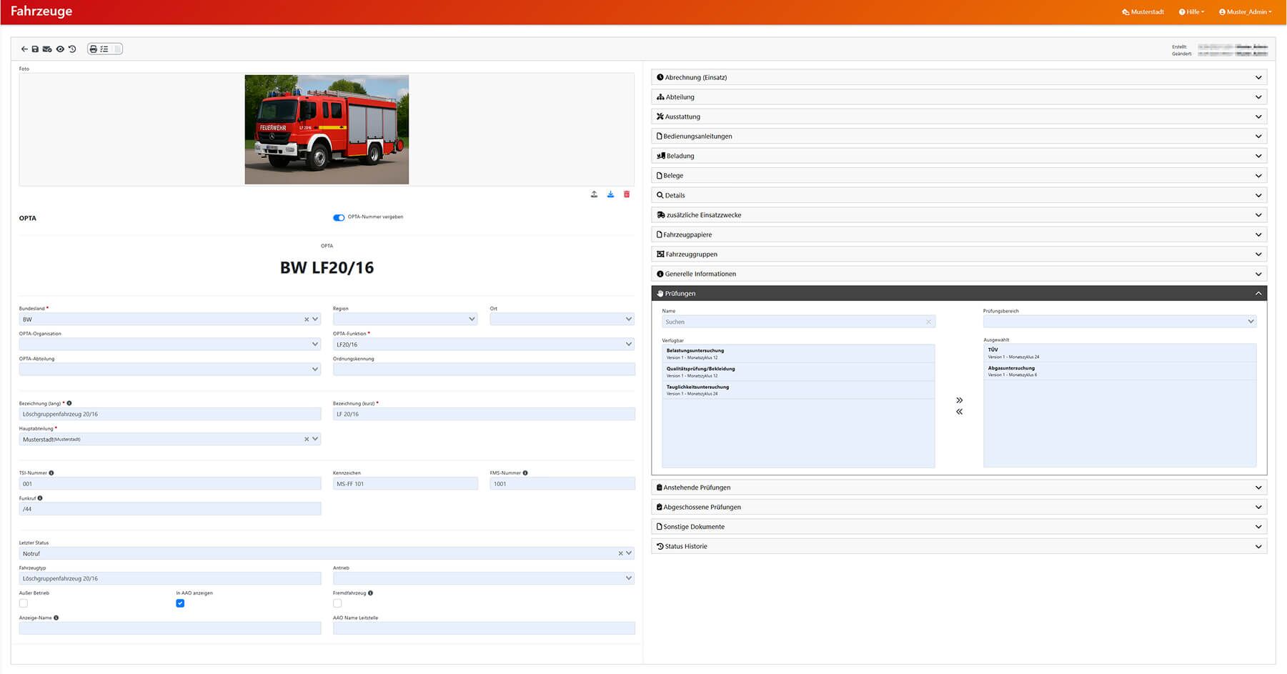 Die Fahrzeug- und Ressourcenverwaltung dokumentiert alle relevanten Stammdaten zentral und nachvollziehbar. Bei Materialien und Ausrüstung werden nicht nur die Artikeldaten, sondern auch sämtliche Prüfprozesse und durchgeführte Prüfungen automatisch protokolliert – lückenlos und revisionssicher. Für Fahrzeuge stehen alle wichtigen Informationen wie technische Daten, Funkkennungen, Kostensätze und Betriebskosten jederzeit bereit. So behalten Sie den Überblick über Einsatzbereitschaft, Prüfintervalle und Wirtschaftlichkeit Ihrer gesamten Ausstattung.
