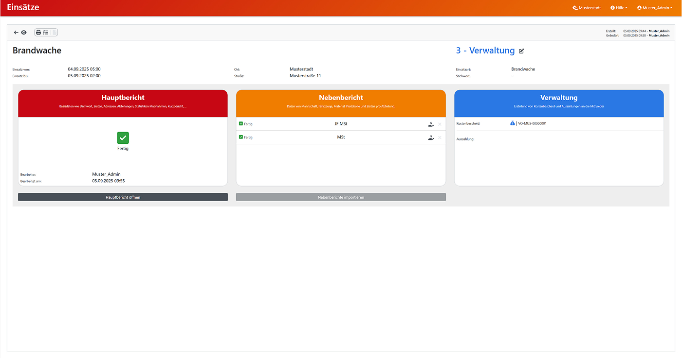 Vom Alarm über die Nebenberichte der Abteilunge zum Hauptbericht der Gesamtwehr – bis zur Abrechnung und dem Kostenbescheid.